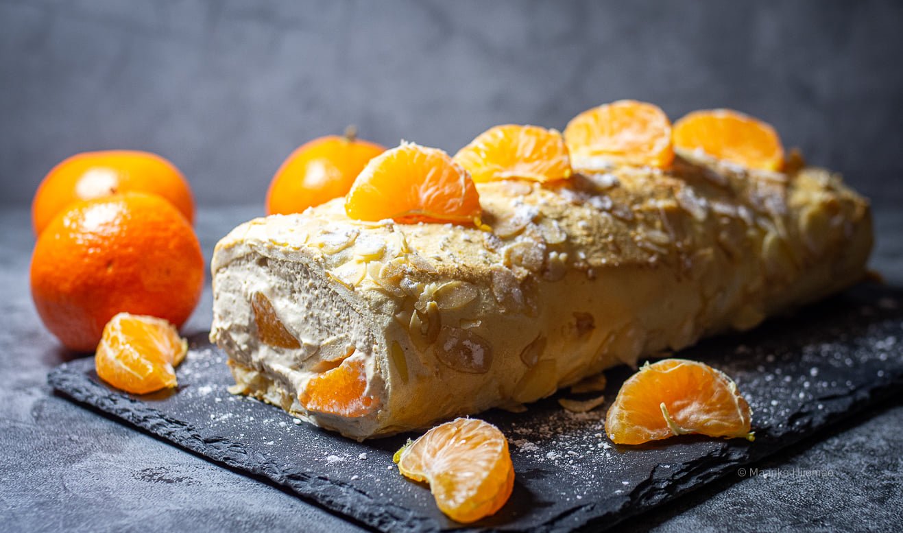 - Kata besee kohupiimakreemiga (jäta äärtesse veidi tühja ruumi, et täidis rulli keerates välja ei hakkaks pressima) ning lao peale mandariiniviilud. Keera beseeplaat pikemast servast küpsetuspaberi abil rulli.