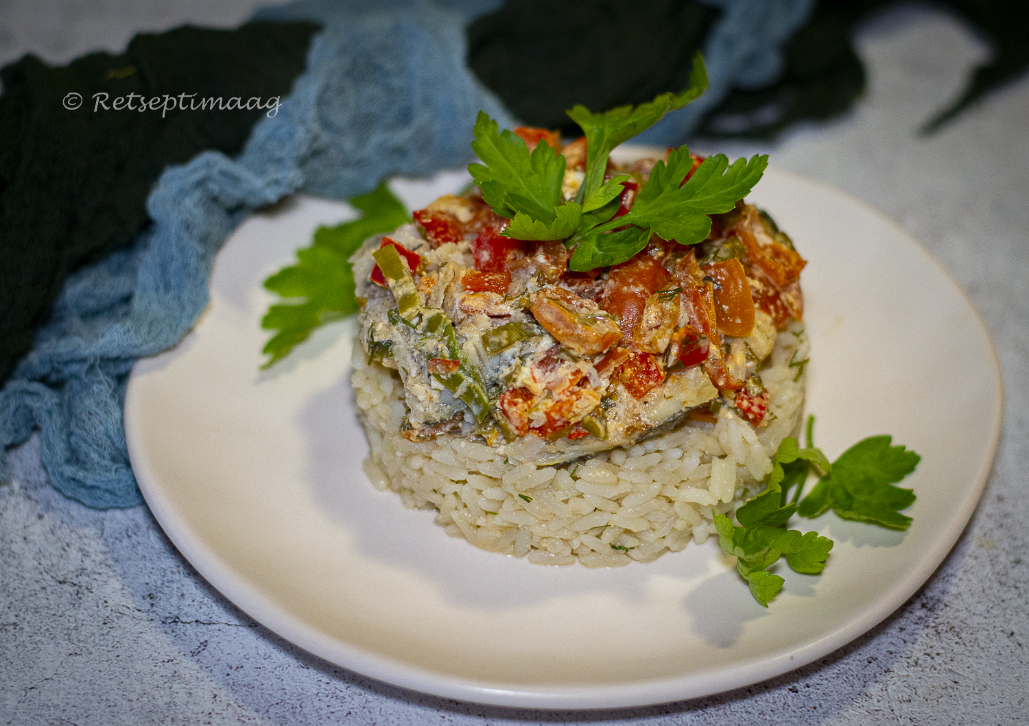 Kreekapärane ahjukala köögiviljadega riisipadjal