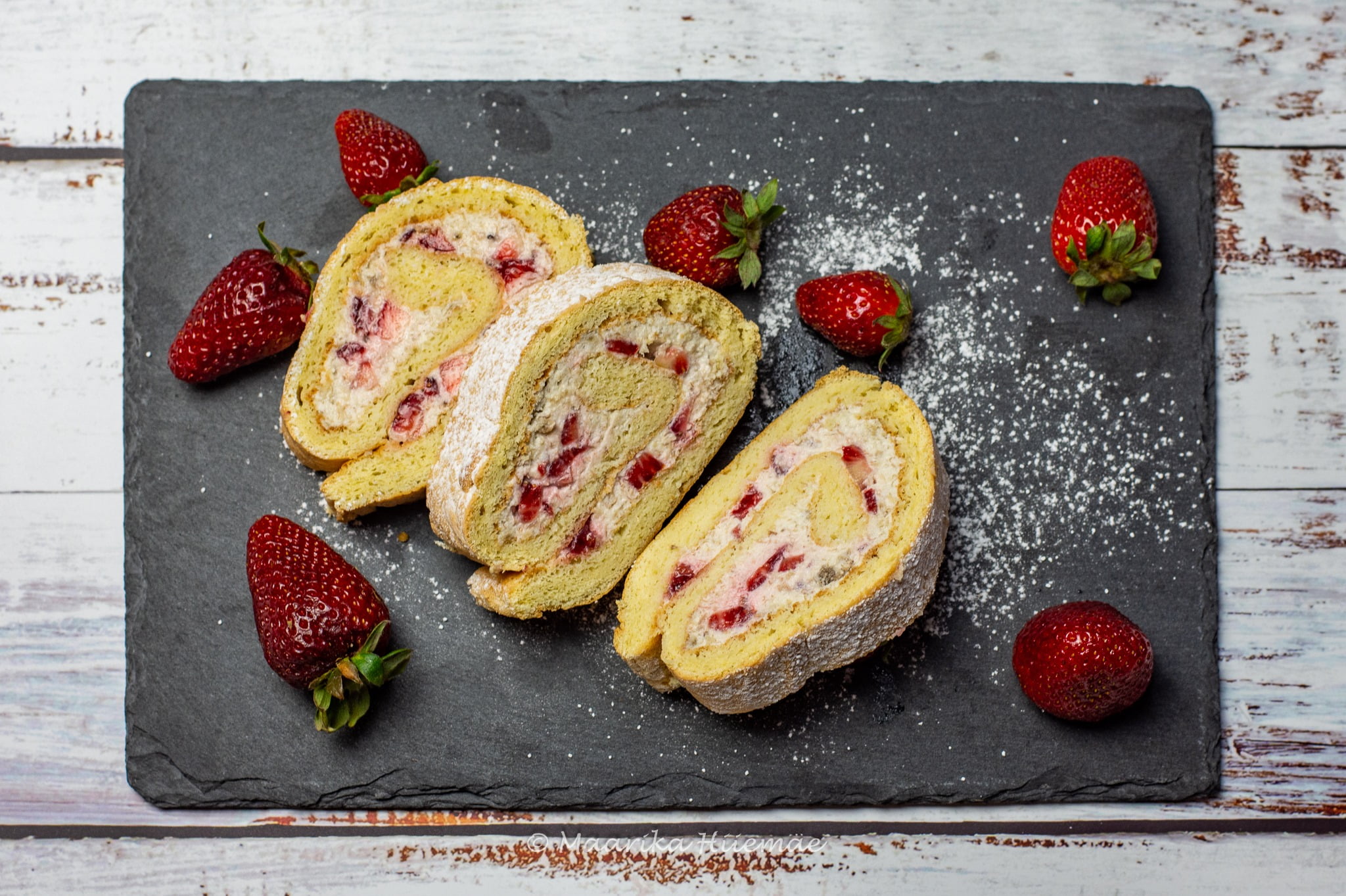 10. Kui biskviit on korralikult maha jahtunud keera see paberist lahti ning määri vahukoore-toorjuustu segu sinna peale. Segule puista tükeldatud maasikad.